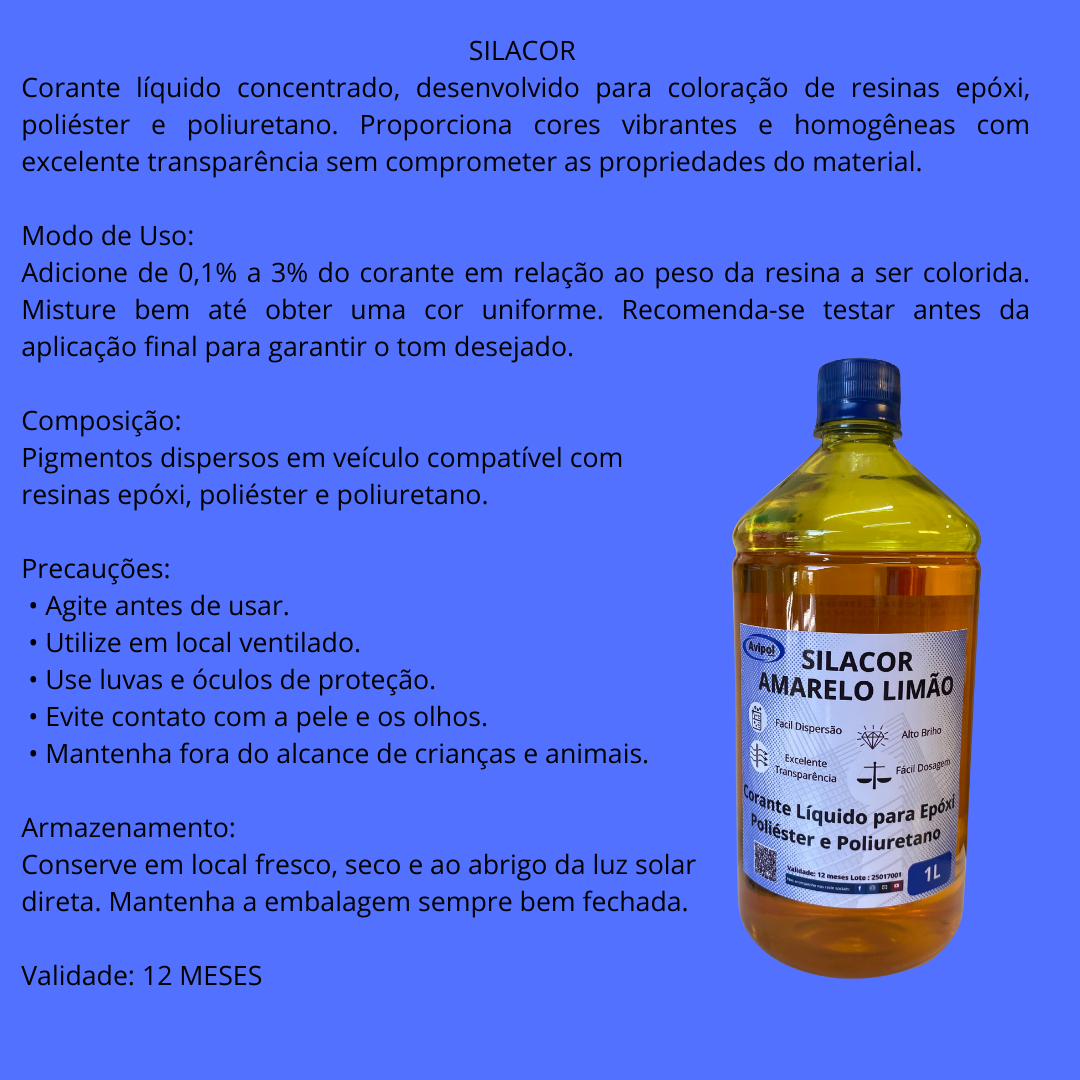 A proporção indicada é de 1% até 3% em relação a resina utilizada, por ser altamente concentrado não é necessário excessos.